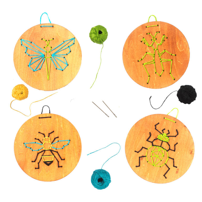 ערכת יצירה של רקמה עם חוטים על גבי לוחות מעץ.